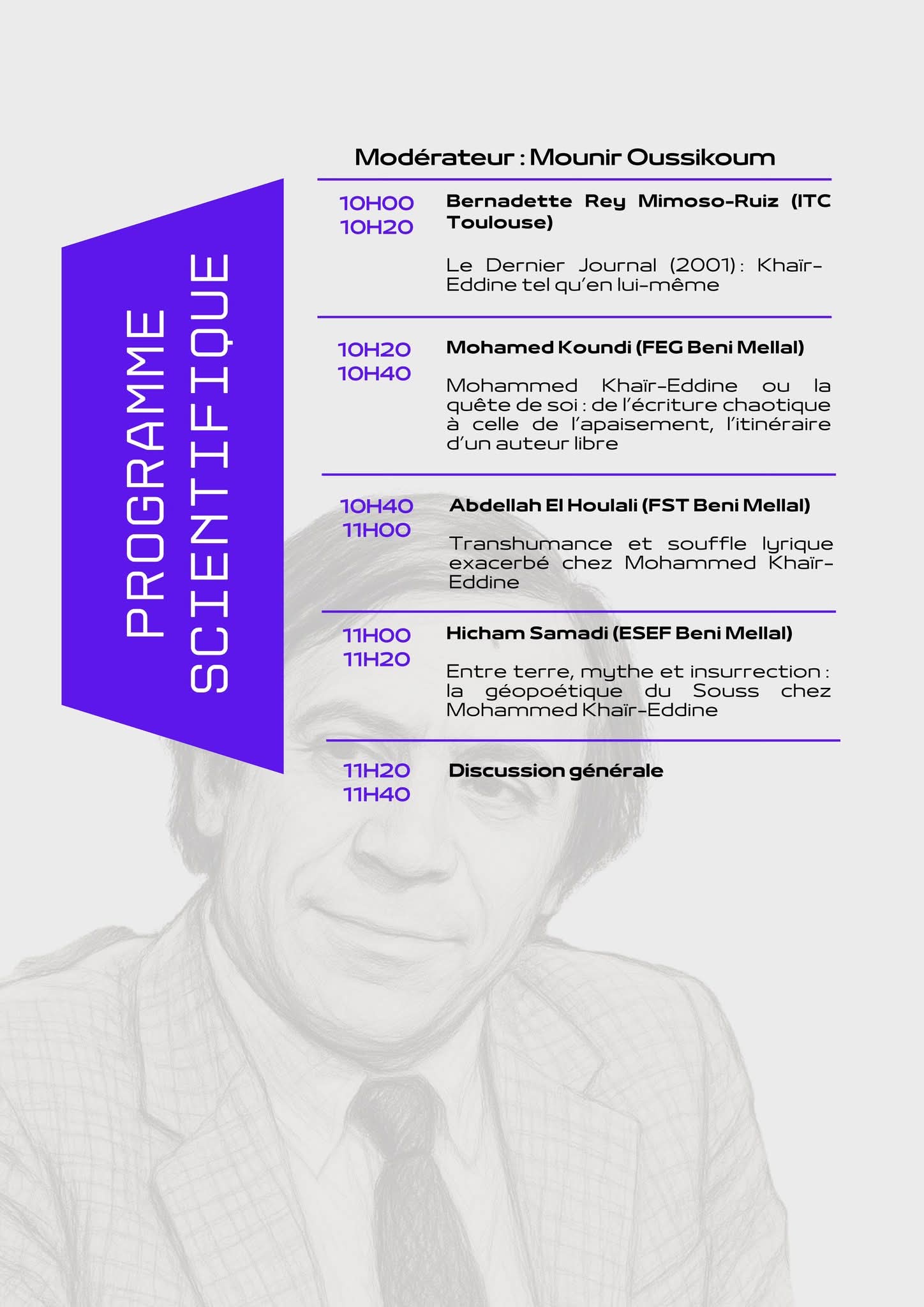 La escritura de Khaïr-Eddine está lejos de ser decorativa; es una postura audaz frente a una realidad que resiste. Este simposio analizará los temas clave que atraviesan su obra, como la autoexpresión, la conexión con Souss como un espacio vivido e imaginado, la tensión entre el desplazamiento, la memoria y la pertenencia, y su compromiso creativo en múltiples lenguas, entre ellas el francés, el árabe y el amazigh.